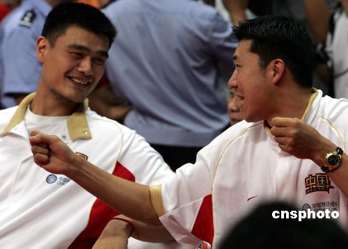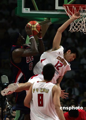 二00六中美篮球对抗赛七日晚上八点在中国广州体育馆开始角逐,中国男篮主场迎战美国梦之队,最终以七十三比一百一十九不敌美国梦七队,以四十六分的悬殊比分输掉了该场比赛。中新社发 任晨鸣 摄