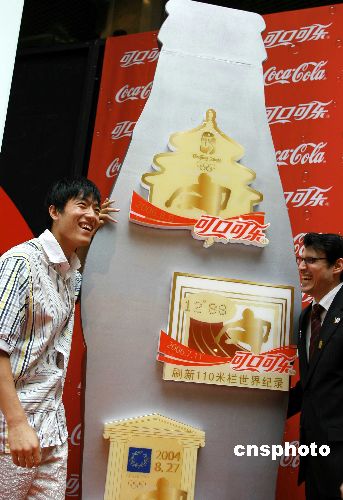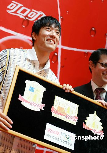 八月八日,在距北京二零零八年奥运会两周年之际,可口可乐(中国)饮料有限公司宣布正式启动“可口可乐北京二零零八年奥运纪念章计划”。在启动仪式上,刚刚在国际田联超级大奖赛洛桑站上打破110米栏世界纪录的中国飞人刘翔亲手揭幕了三枚以他为主题的纪念章,这套珍贵的纪念章也成为了可口可乐北京二零零八年奥运纪念章计划的开篇之作。中新社发 毛建军 摄