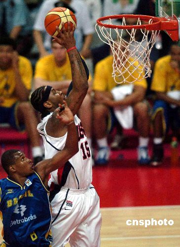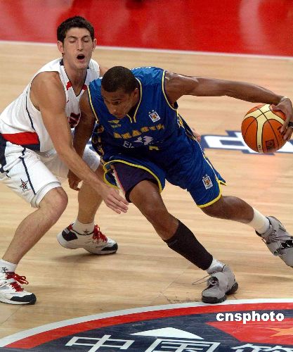 2006年8月8日晚,美国队员保罗强行推进。当天为备战世锦赛热身,美国“梦七”队与巴西队在广州体育馆较量。终场美国“梦七”队以90比86险胜巴西队。中新社发 吴峻 摄