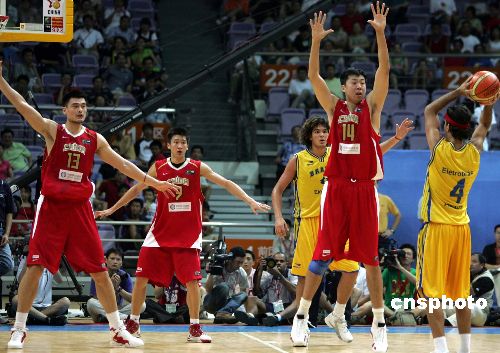 8月13日晚,2006斯坦科维奇洲际篮球冠军杯小组赛最后一轮在古都南京市举行,中国媒体一直爆炒的“明郅组合”终于在与巴西队的比赛中亮相。中新社发 任晨鸣 摄