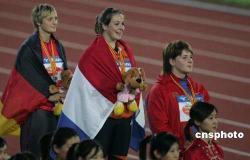 八月十五日,第十一届世界青年田径锦标赛在北京朝阳体育中心开幕,一举创下一百八十个国际田联会员协会的一千四百五十一名运动员参赛的纪录,其中男运动员八百零六名,女运动员六百四十五名。图为荷兰选手夺得本届赛后首枚金牌——女子铅球金牌。中新社发 武仲林 摄