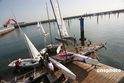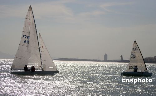 2006年8月17日,距离2006青岛国际帆船赛开幕还有一天,各国选手进行最后训练,以此达到最佳状态。中新社发 吴芒子 摄