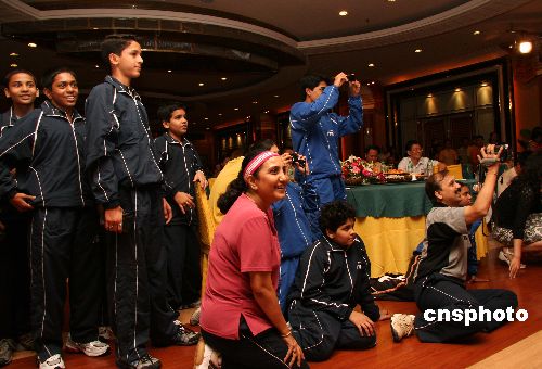 八月二十一日晚,二00六年国际青少年乒乓球训练营在河北正定国家乒乓球训练基地开营。来自美国、新西兰等十七个国家和地区的二百多名乒乓球运动员将参加为期十天的训练营活动。图为开营仪式上的印度代表队。中新社发 张澍 摄