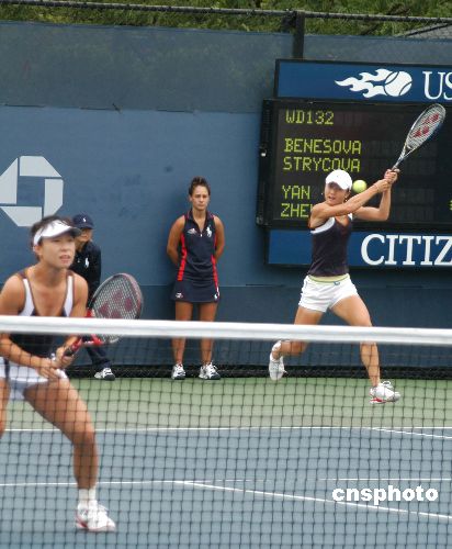 九月一日,本次美网女双夺冠大热门郑洁、晏紫组合凭借经验,在抢七中惊险的战胜捷克对手,晋级女双第二轮。图为郑洁(前)、晏紫(后)在比赛中。中新社发 刘小青 摄