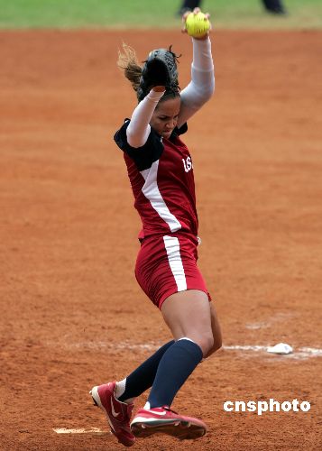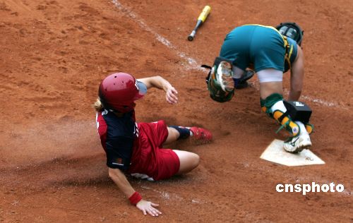 九月三日,美国队(红蓝衣)在北京丰台垒球场举行的第十一届世界女子垒球锦标赛第二轮首场比赛中以十一比二战胜雅典奥运会亚军澳大利亚队。中新社发 武仲林 摄