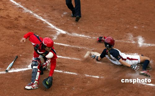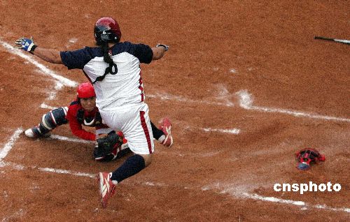 九月四日,美国选手Caitlin Lowe在与日本队比赛中成功返回本垒,为美国队获得一分。当日,日本女垒在北京丰台垒球场举行的第十一届世界女子垒球锦标赛决赛阶段比赛中以三比一大胜美国队,进入决赛。中新社发 武仲林 摄