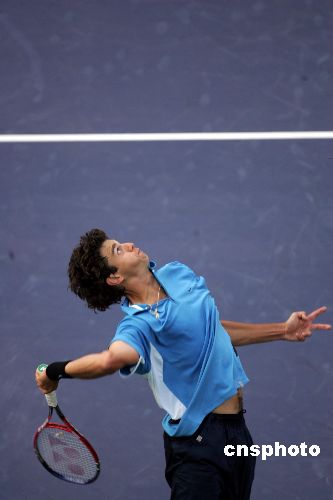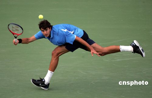 九月十二日,赛会四号种子、ATP八月最新世界排名十二的克罗地亚选手安西奇在比赛中奋力击球。当日,安西奇在北京网球中心举行的二○○六中国网球公开赛正赛第二天比赛中以二比一战胜西班牙选手洛佩兹,晋级下一轮。中新社发 武仲林 摄