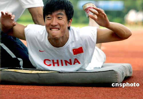九月十九日,刚刚在第十届国际田联世界杯上获得男子一百一十米栏亚军的刘翔,一回到上海就投入到训练中,积极备战将于本月二十三日举行的上海国际田径黄金大奖赛。图为刘翔在上海莘庄训练基地进行身体训练。中新社发 汤彦俊 摄