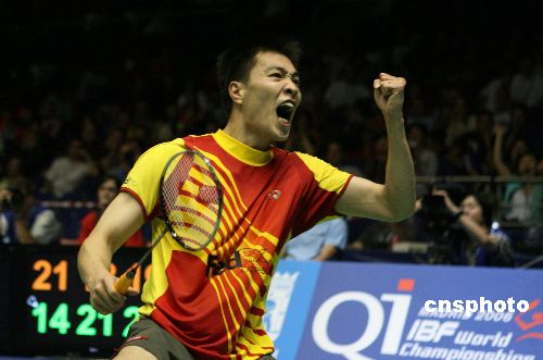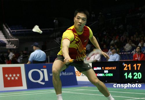 9月21日,在西班牙首都马德里举行的第十五届世界羽毛球锦标赛上,中国选手陈宏在第三轮男子单打比赛中以2:1险胜印尼名将陶菲克,晋级八强。中新社发 宗金柱 摄