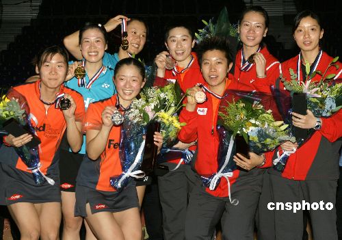 9月23日,在西班牙首都马德里举行的第十五届世界羽毛球锦标赛上,中国队在女子双打决赛中包揽了冠、亚、季军。中新社发 宗金柱 摄