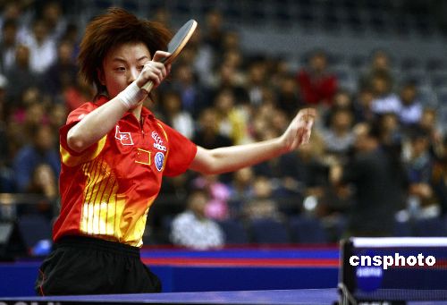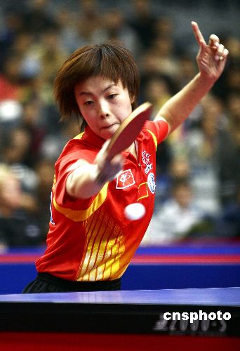 九月二十九日晚,在新疆乌鲁木齐举办的2006年乒乓球女子世界杯比赛中,中国选手张怡宁与美国老将高军展开激烈角逐,最终以四比二的战绩战胜对手,以两战两胜的佳绩名列A组第一,晋级八强。中新社发 刘新 摄