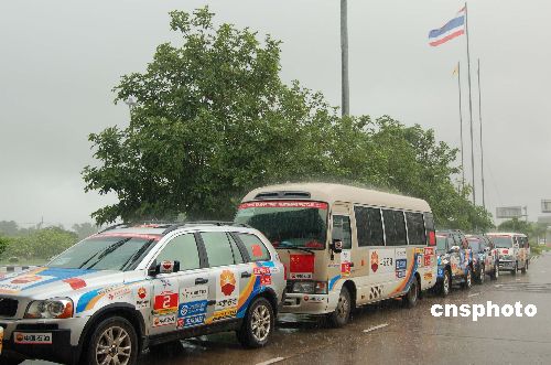 “中国石油杯”二○○六中国—东盟国际汽车拉力赛车队十月九日早上冒雨从老挝首都万象出发,经过友谊桥口岸后,进入泰国境内,由于在距离泰国首都曼谷六十公里处开始堵车,车队一直到十日凌晨才抵达曼谷。中新社发 刘万强 摄