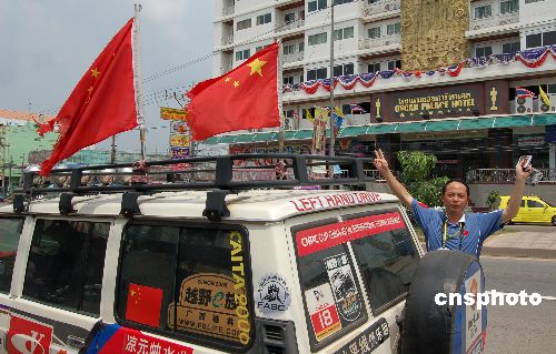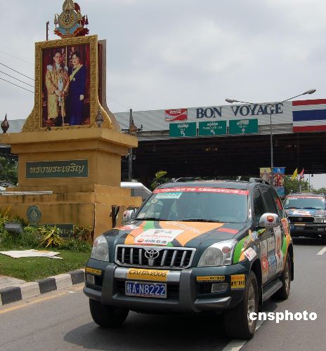 十月十五日,二○○六中国—东盟国际汽车拉力赛车队从马来西亚第三大城市怡保发车继续返程,中午车队顺利通过关口再次进入泰国境内,泰国路上有众多的庆祝泰国国王登基六十年的画像和旗帜。中新社发 刘万强 摄