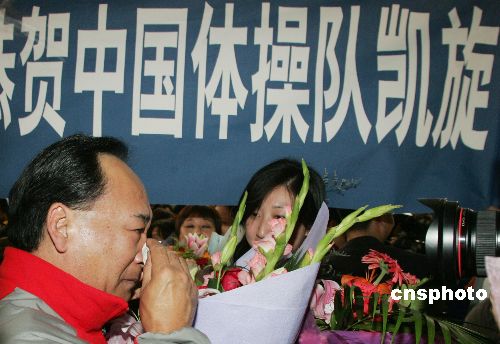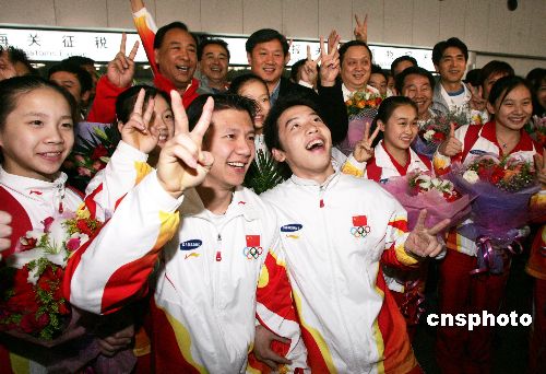 十月二十四日,破纪录的夺得八枚金牌的中国体操队结束了二零零六年世锦赛征程,载誉回到北京,受到社会各届的热烈欢迎。中新社发 武仲林 摄