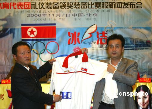 中国上海冰洁公司赞助朝鲜体育代表团近300人参加第十五届亚运会比赛服装等装备仪式7日在北京举行。中新社发 赵振清 摄