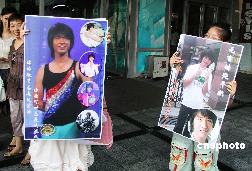 2006年8月4日,上海高温下的南京路、西藏路,不少自发为上海“好男儿”10号宋晓波宣传拉票的上海女孩,顶着酷暑,热情洋溢,奔走呼号。其细诉“偶像”诸多好处的娓娓感言,甚是令人动容。中新社发 蒋振雄 摄