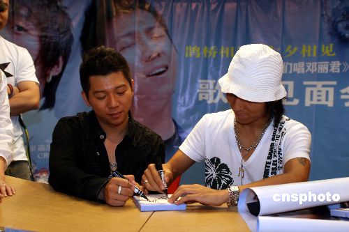 8月30日,羽泉、张靓颖分别在大世界和FAB音像店举办了“我们唱邓丽君”和“我爱邓丽君”的专辑签名会。当日恰逢今年第二个七夕情人节,主办方特意安排在两地举办也寓意七夕鹊桥相会。中新社发 袁方 摄