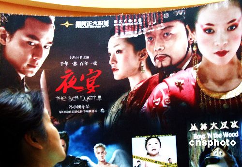 2006年9月18日,《夜宴》首日票房突破1200万元,不仅打破了冯小刚电影有史以来首日票房的最高纪录(《天下无贼》的首日票房是800万元),而且打破了今年国产片首日票房低于进口片的惯例,成为今年首日票房最高影片。照此全国总票房有望达1.3亿元。中新社发 井韦 摄