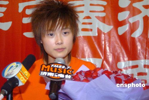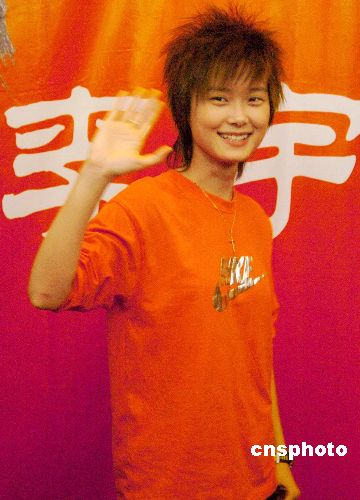 2006年10月10日下午,歌手李宇春携带其第一张专辑《皇后与梦想》到济南宣传。李宇春一到酒店随即召开记者见面会,向媒体推介专辑。11日李宇春将与歌迷见面,签售专辑。中新社发 张侃 摄