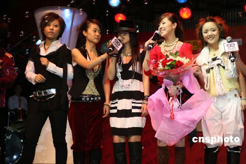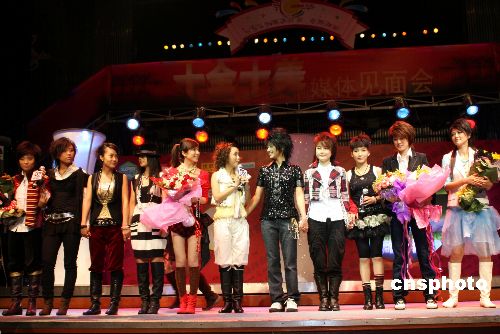 10月10日下午,超级女生2006年10强选手齐聚北京阳光俱乐部,举办“十全十美”北京媒体见面会。各选手FANS也爆棚到场。此次活动是超女活动结束后10强人第一次齐聚北京和媒体见面,据悉,全国巡回演唱会也即将展开。中新社发 袁方 摄