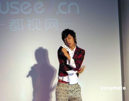 在中国内地著名娱乐节目“我型我秀”中以搞怪获得“人气王”称号的师洋,十月十六日在上海大型网络视频大赛——“都市猎人”启动活动上继续搞怪。中新社发 姜煜 摄