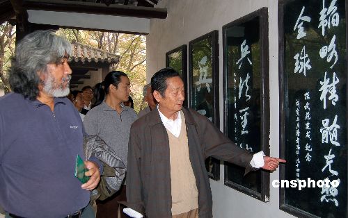 11月2日,还在浙江赶排《鹿鼎记》的著名导演张纪中突然出现在苏州穹窿山。经了解,张导欲拍历史正剧《孙子兵法》,目前正在与苏州市孙武子研究会的有关专家对孙武的生平史实进行考证,以确定这部历史名篇的最后构架。图为著名导演张纪中在《孙子兵法》诞生地孙武苑考察。中新社发 邱勇 摄