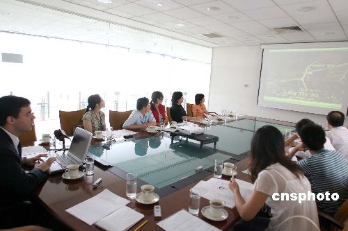 八月一日,以色列驻华使馆新闻官艾思卡就近期中东冲突中平民及联合国观察员遇难问题召开新闻发布会。图为现场播放黎巴嫩南部的加纳村航拍画面。中新社发 廖文静 摄