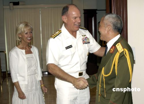 中美军队交流近来得到加强,图为出席中国使馆建军招待会的美军参谋长联席会议七局局长毛可升少将和夫人,受到中国使馆国防武官蔡继华少将的欢迎。中新社发 邱江波 摄