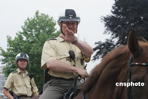 德国当地时间六月二十七日,世界杯八分之一决赛巴西与加纳的比赛在多特蒙德世界杯体育场进行,多特蒙德警方为维护秩序、保障世界杯正常进行加强了警力,这是街头巡逻的骑警。中新社发 盛佳鹏 摄