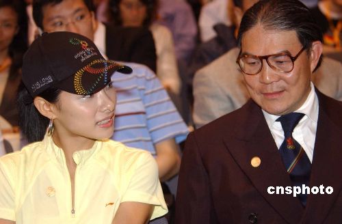 7月4日,香港奥委会主席霍震霆与专程来港的前奥运体操冠军刘璇,在 “香港2009东亚运动会商贸推介会”上交谈,剖析东亚运动会给香港带来的商机。中新社发 洪少葵 摄