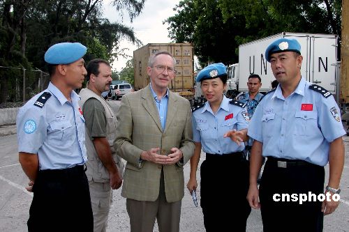 6月30日,联合国秘书长安南的特别代表联海团团长爱德蒙德.莫雷特先生在警察总警监缪尔先生的陪同下专程对中国防暴队进行访问。这是爱德蒙德.莫雷特先生今年6月任联海团团长后首次对维和防暴队进行访问。中新社发 陈 进 摄