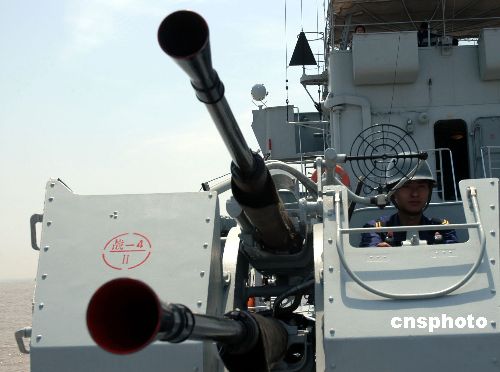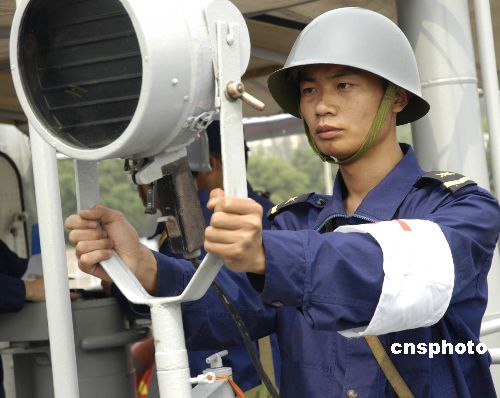7月10日,黄海某海域波飞浪卷。东海舰队某猎潜艇大队对“敌”运输船实施临检拿捕演练正悄悄进行。9时演练开始。猎潜艇按编队指挥部命令,冒酷暑,火速赶往某海域对为“敌”服务的一艘运输船实施拦截。艇长令信号兵发信号,按照国际惯例示意其停船接受检查。信号发出运输船不理会,并向另国海域逃窜。艇长下达“临检拿捕部署”命令,全体艇员立即各司其职。先分别用汉、闽南话向“敌”喊话,但“敌”船却先开火,“打伤”艇上人员,“敌”船拒不接受检查,妄图逃跑,火力掩护小组以冲锋枪和轻机枪迅速予以还击。一阵痛击后,艇上继续用两个语种喊话。9点40分,“敌”船终于发信号,愿接受检查。我艇登船小组兵分三组,在火力掩护下登船检查。11时整个行动结束。演练总指挥介绍:组织这个课题,从难从严,为的是在战时随时能拉得出、打得赢。中新社发 毛昭胜 摄
