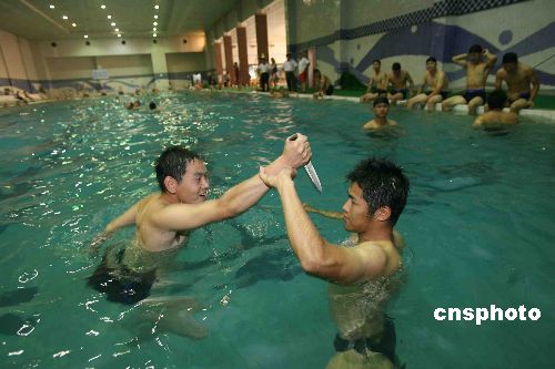 七月十二日,河南省郑州市特警支队在水中训练格斗。当日,郑州市特警三大队三十余名特警,手拿匕首在郑州市某大型游泳场馆内,进行水中擒敌术的科目训练。针对郑州市周边紧邻黄河等复杂情况,和近日黄河多次出现溺水伤人事故的发生,郑州市特警三大队还特别安排了水中救援的训练科目,此次训练科目属河南特警首次。中新社发 慎重 摄
