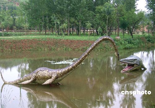 | 图为西峡恐龙遗迹园内两只恐龙在水中搏斗。2006年7月6日,我国首座大型恐龙主题公园西峡恐龙遗迹园开始接待游客。据了解,西峡白垩纪恐龙蛋化石群以其数量之多、分布之广、保护之完整被称为继“秦始皇兵马俑”之后的“世界第九大奇迹”。西峡恐龙遗迹园位于河南南阳市西峡县丹水镇,由恐龙蛋化石博物馆、恐龙蛋化石遗址、仿真恐龙园和地质科普广场组成。占地4000平方米,开挖总长度为168米,剥离恐龙蛋化石700余枚。地下展馆尤如树枝状,众多恐龙蛋化石暴露于坑道的天花板上,充分展示恐龙蛋化石的原始原貌。中新社发 陈琰炜 摄