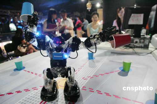 七月十一日,联想集团在北京发布目前全球首款支持蓝牙互联平台的扬天系列新品,该产品融合了多项全球领先的专利技术,拥有安全密钥、私密空间、互联一点通、通讯录及短信中心、预装杀毒软件等五大核心功能,破解了中小企业成长过程中所遇到的安全性等一系列难题。图为工作人员现场演示扬天PC通过蓝牙技术操控同样拥有蓝牙功能的机器人完成一系列高难动作。中新社发 武仲林 摄