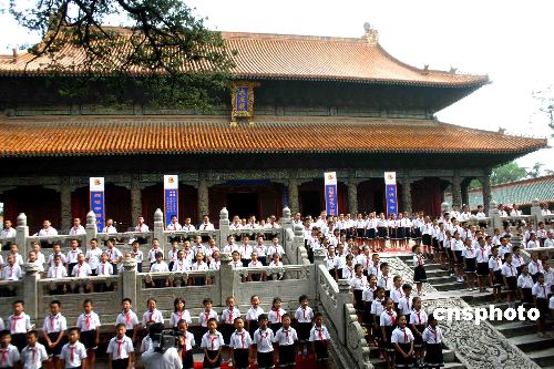 “学而时习之不亦乐乎”、“有朋自远方来不亦乐乎”,在稚嫩的童声诵读《论语》等国学经典著作声中,首届孔子修学旅游节七月十一日在孔子故里曲阜孔庙大成殿前拉开了帷幕。首届曲阜孔子修学旅游节,旨在于将观光旅游和学习优秀传统文化结合起来。图为开幕式上曲阜市实验小学的500多名小学生诵读《论语》等国学经典篇章。中新社发 薛红军 摄