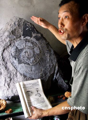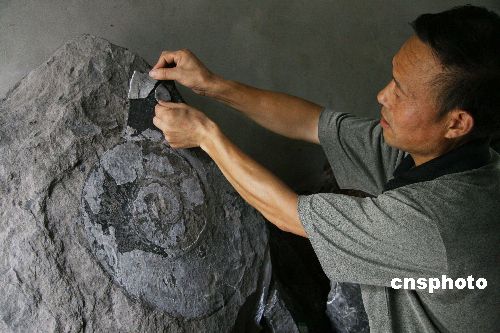 | 7月11日,安徽巢湖古生物爱好与研究者任怨先生公开展示他近日在该市东风石矿附近一矿山发现的一块巨型珍稀古海洋生物鹦鹉螺化石。据介绍,此化石高53厘米、宽42厘米,经安徽师范大学王心源教授及西北大学、中国海洋大学、南京大学、中国石油大学等专家鉴定,确定此化石为寒武纪至奥陶纪时期化石,为中国目前最大的鹦鹉螺化石(中国地质博物馆收藏的仅有拳头般大小)。据了解,生物界称珍稀海洋生物鹦鹉螺化石为海洋水下“大熊猫”。中新社发 李远波 摄