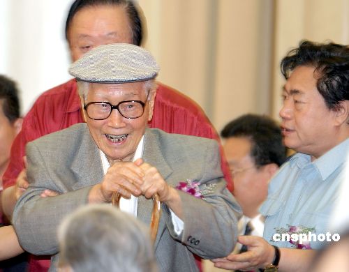 七月十八日,国画大师李苦禅的生前好友、齐白石的得意门生许麟庐先生,为李苦禅艺术馆落成向人们合拳致意。当日,山东省高唐县相关组织,在北京人民大会堂宣布李苦禅艺术馆开馆暨中国(高唐)书画艺术博览会,将于今年九月十五日在高唐县举办。中新社发 廖攀 摄