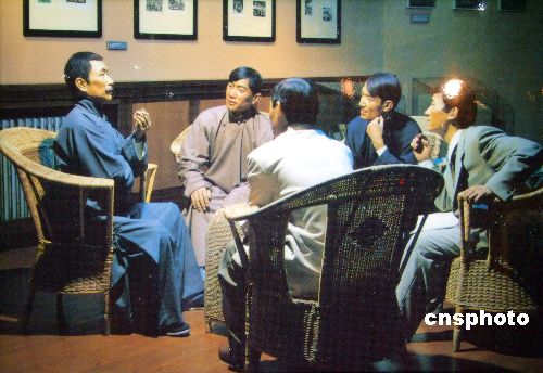 2006年6月27日,《丰碑———纪念中国共产党诞生85周年,上海市爱国主义教育基地大联展》在上海展览中心对公众免费开放。蜡像“鲁迅与青年木刻家座谈”以绘画的形式呈现在观展者面前,表现鲁迅逝世前11天与青年木刻家座谈的情景。中新社发 井韦 摄