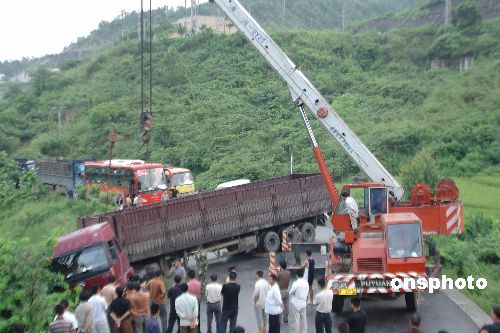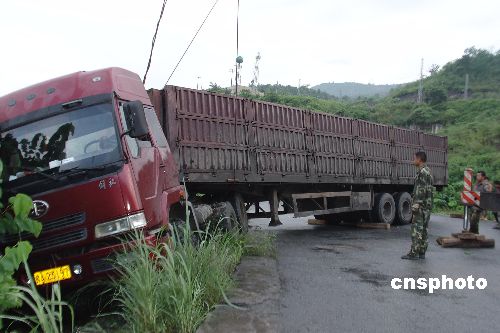 六月二十七日凌晨二时许,一辆加长货柜车从广西百色市开往百色隆林县方向,当车行驶至百色市右江区汪甸乡喜乡村的324国道一转弯处时,因紧急刹加上下雨路滑,该车头冲出左边路基外面,车尾却向右往前摔坏一辆相向而行的面包车后斜横在公路上,造成交通阻塞六个多小时,受阻车辆排成至少五公里长,直至当日上午八点二十五分才恢复通车。中新社发 杨志雄 摄