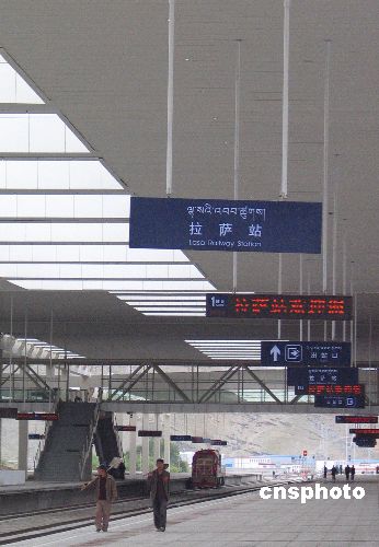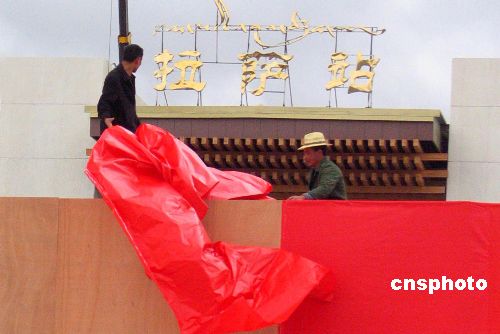 2006年6月28日,工人在拉萨火车站布置青藏铁路线开通庆典会场。拉萨火车站将作为7月1日青藏铁路线开通庆典会场。中新社发 吴芒子 摄