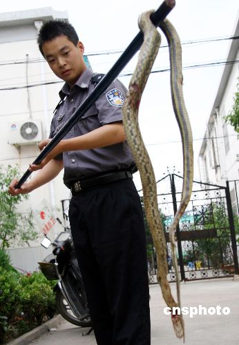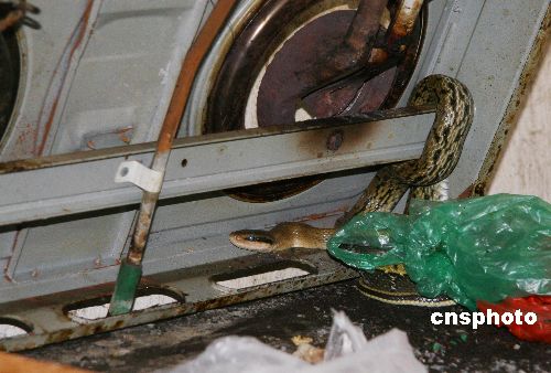 | 6月29日一大早,家住安徽巢湖火车站一小区的李女士家的小狗在厨房一直叫个不停,李女士与儿子前去厨房查看,发现小狗在与一条一米多长的蛇“战斗”,只见小狗一边叫着一边冲上几步,而蛇首立起半米高,向小狗吐出信子。女主人与儿子见状,忙上前帮助小狗,没想到蛇一点不“退缩”,相反,蛇首立得更高,向人与狗“挑战”。主人只得主动“休战”,蛇则乘机钻进液化气灶内。李女士拨打110求助,民警赶至,将一米多长的蛇从液化气灶台内驱出消灭。中新社发 李远波 摄