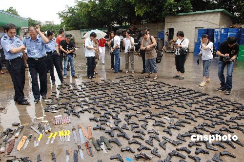六月三十日,深圳海关集中销毁一批走私仿真枪支及仿真枪配件。其中仿真枪一千二百六十支、电击枪三支、气枪六支、配件及子弹、管制刀具、避弹衣、电警棍等。中新社发 闻子 摄