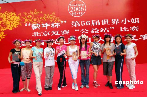 由首都文明工程基金会、北京娱乐信报社、北京现代商报社和香港美丽新世界有限公司共同主办的2006世界小姐中国赛区北京大赛进入了复赛第四站——公益站。佳丽们不仅为门头沟百花山脚下的老百姓献上了精心准备的节目,而且还清理了游客扔在百花山景区的垃圾。中新社发 李伯男 摄