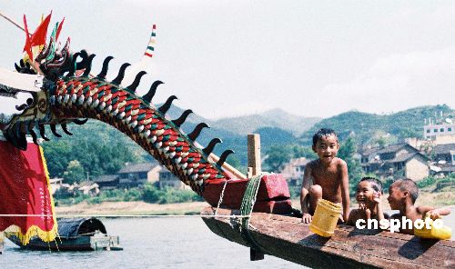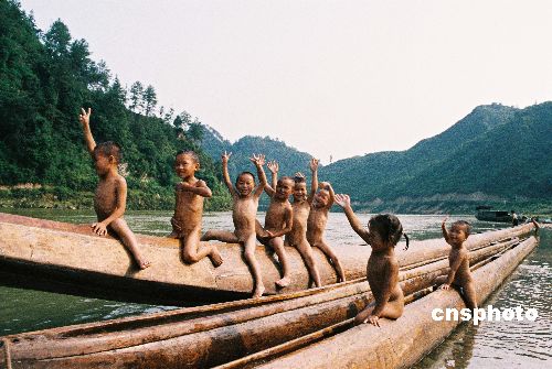 贵州省台江县施洞镇, 龙舟下江的那天是苗家孩儿快乐的日子,孩儿们光着身子在清水江尽情的嘻戏,组成一幅生动的“百子图”。中新社发 熊德成 摄