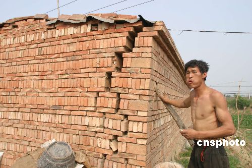 7月4日11时56分河北文安发生5.1级地震,中新社记者在从北京赶往震中途经文安附近农村时,见到有简易民房被地震震开裂。这次地震震中位于北纬38.9度、东经116.3度的隶属河北省廊坊市的文安县,北距北京约120公里。中新社发 廖攀 摄