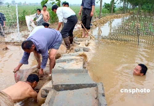 7月初,江苏连降暴雨,射阳县累计降雨量达289.7毫米,该县还是主要行洪走廊,当地洪水水位居高不下,许多地区河水倒灌,村民纷纷筑堤自救。中新社发 顾枫 摄