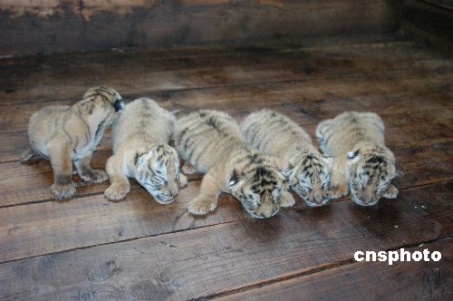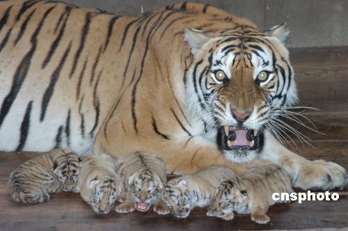 7月3日,黑龙江牡丹江横道河子猫科动物饲养中心东北虎林园,一只成年虎一胎产下5只小老虎。5只小老虎憨态可鞠,一会打哈欠、一会钻到妈妈的怀里,虎妈妈则警惕地呵护着虎宝宝。中新社发 张克非 摄