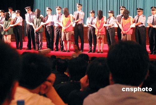 7月7日,北京警方对刘艳华等30名利用手机短信及网络招嫖、组织介绍容留卖淫和以娱乐场所为依托从事淫秽、涉恶活动以及暴力抗法等违法犯罪活动的嫌疑人及北京市大脸猫娱乐中心等10家娱乐场所依法予以刑事拘留和停业整顿的处理。在召开的公开处理大会上,三十一名被处理的犯罪嫌疑人头戴黑色头套,头套在眼、口、鼻部位采用透气的黑纱面料。警方表示,这是犯罪嫌疑人首次被允许戴上头套,目的是为了防止其在公众面前曝光,充分尊重和保护其合法权利。中新社发 郝军 摄