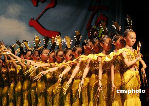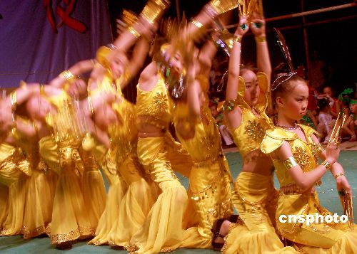 7月7日,在山东省平阴县广场由龙山小学师生精心编排的少年版千手观音舞蹈拉开了龙山小学专场消夏晚会的帷幕,精彩的演出赢得了阵阵喝彩。晚会上师生们为广大市民献上了歌曲、戏曲、舞蹈、相声等丰富的节目,让市民在欢笑中度过一个愉快的周未。中新社发 俄国庆 摄